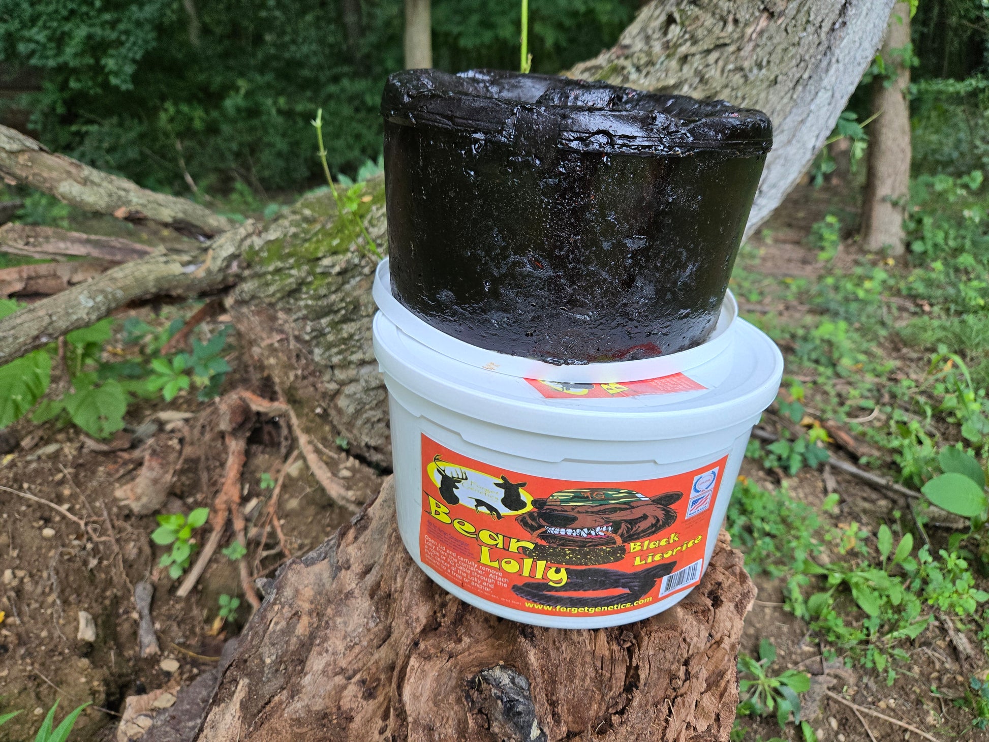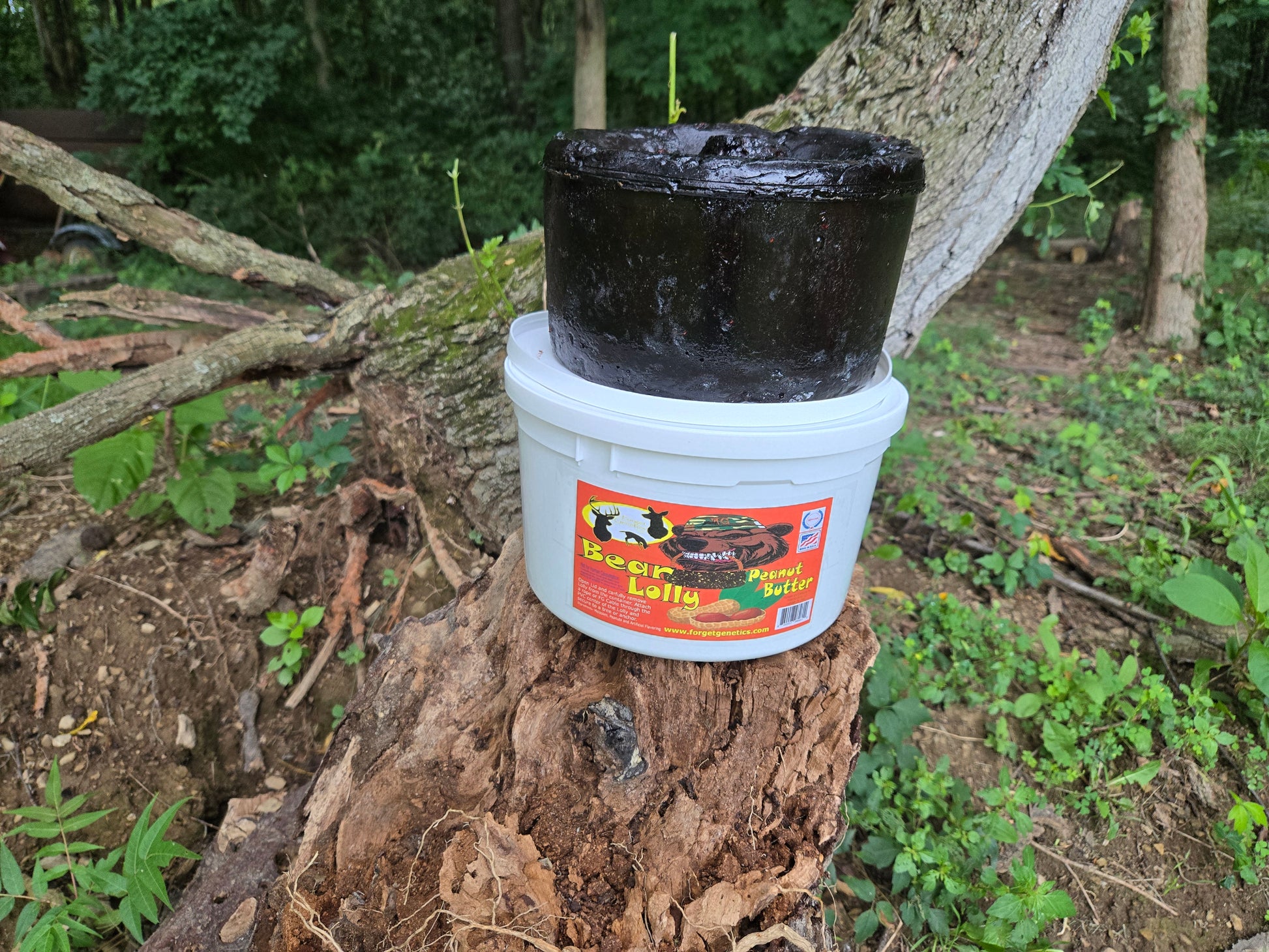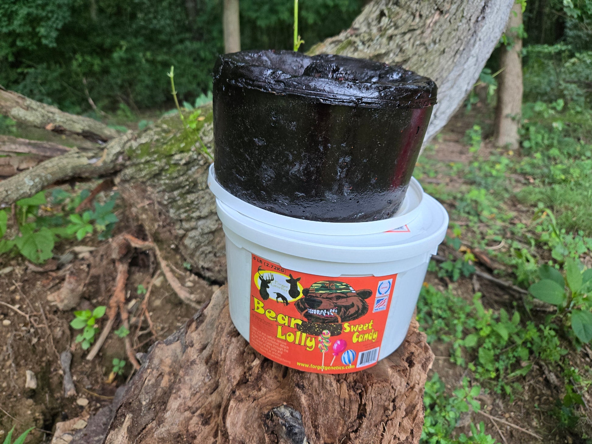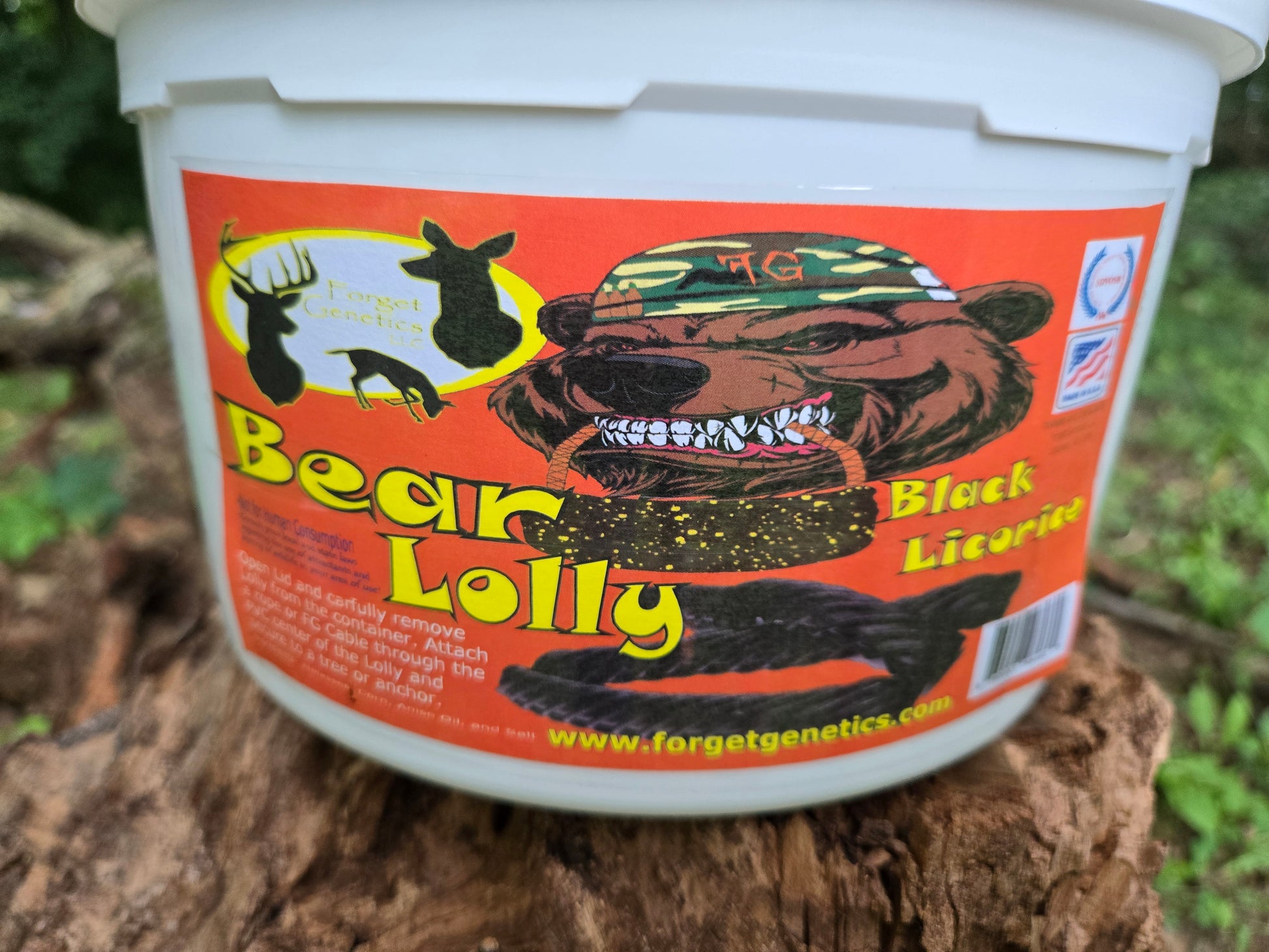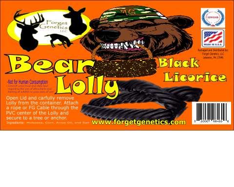 Our Forget Genetics Bear Lolly is a hardened blend of Molasses and proprietary ingredients designed to drive bear crazy! A bigger version of our popular Acorn Lolly only larger and much more bear durable. Whether you are hunting or just want some of the best videos, these are for you. All of our Lolly's come in a 6 pound tub with a piece of PVC tubing through the center to allow you to hang it from a tree or anchor down. We offer free Shipping on all of our Bear Lolly's. Available in 3 Flavors, Black Licorice, Sweet Candy and Peanut Butter